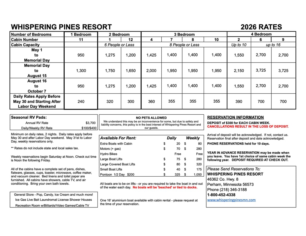 Click here to view Whispering Pines Resort 2026 availability. Also added to the calendar are dates the pontoon rental is available.